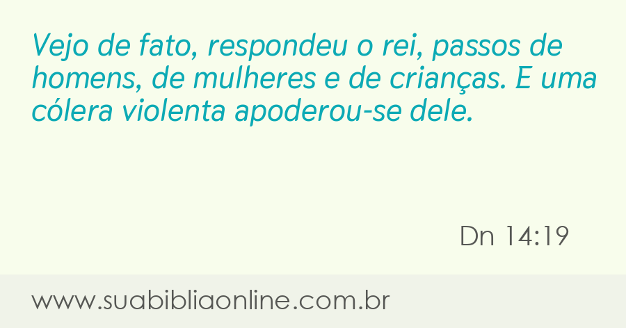 Faça sua busca na Bíblia. Sua Bíblia Online.Versão completa da Bíblia em Português com todos os livros, capítulos e versículos bíblicos.Vejo de fato, respondeu o rei, passos de homens, de mulheres e de crianças. E uma cólera violenta apoderou-se dele.
