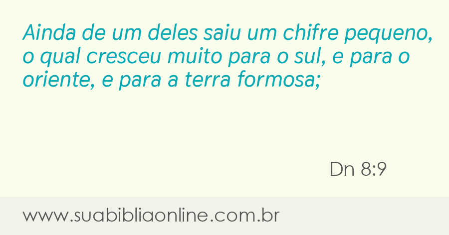 Faça sua busca na Bíblia. Sua Bíblia Online.Versão completa da Bíblia em Português com todos os livros, capítulos e versículos bíblicos.Ainda de um deles saiu um chifre pequeno, o qual cresceu muito para o sul, e para o oriente, e para a terra formosa;