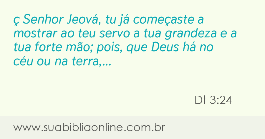 Ó Senhor Jeová, tu já começaste a mostrar ao teu servo a tua grandeza e a tua forte mão; pois, que Deus há no céu ou na terra, que possa fazer segundo as tuas obras, e segundo os teus grandes feitos?