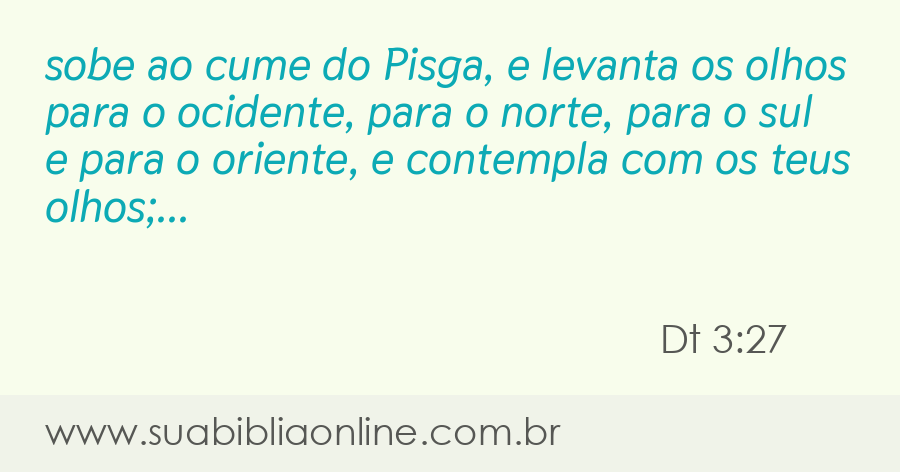 sobe ao cume do Pisga, e levanta os olhos para o ocidente, para o norte, para o sul e para o oriente, e contempla com os teus olhos; porque não passarás este Jordão.