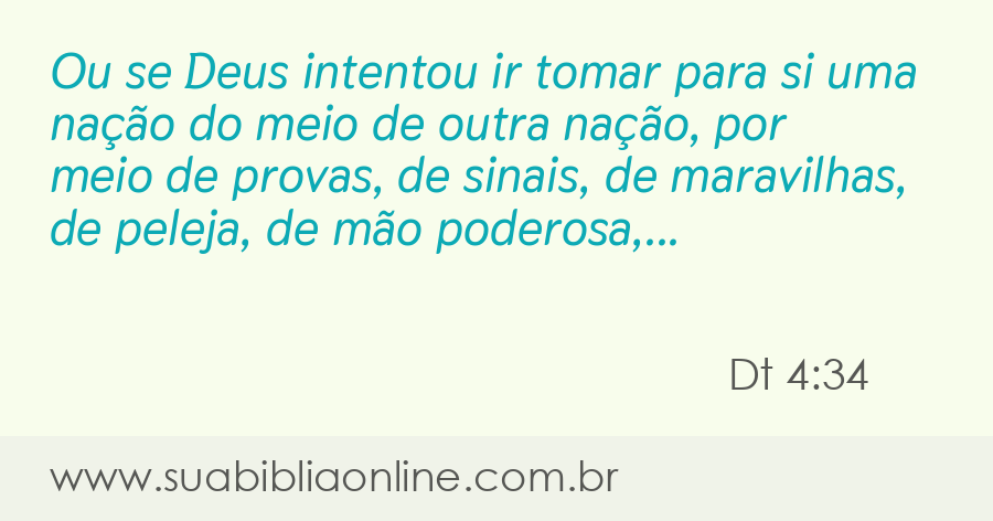 Ou se Deus intentou ir tomar para si uma nação do meio de outra nação, por meio de provas, de sinais, de maravilhas, de peleja, de mão poderosa, de braço estendido, bem como de grandes espantos, segundo tudo quanto fez a teu favor o Senhor teu Deus, no Egito, diante dos teus olhos?