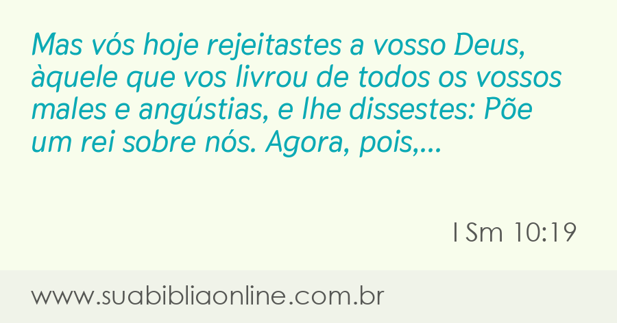 Faça sua busca na Bíblia. Sua Bíblia Online.Versão completa da Bíblia em Português com todos os livros, capítulos e versículos bíblicos.Mas vós hoje rejeitastes a vosso Deus, àquele que vos livrou de todos os vossos males e angústias, e lhe dissestes: Põe um rei sobre nós. Agora, pois, ponde-vos perante o Senhor, segundo as vossas tribos e segundo os vossos milhares.