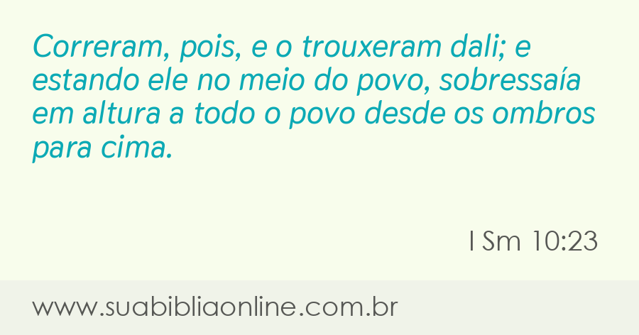 Faça sua busca na Bíblia. Sua Bíblia Online.Versão completa da Bíblia em Português com todos os livros, capítulos e versículos bíblicos.Correram, pois, e o trouxeram dali; e estando ele no meio do povo, sobressaía em altura a todo o povo desde os ombros para cima.