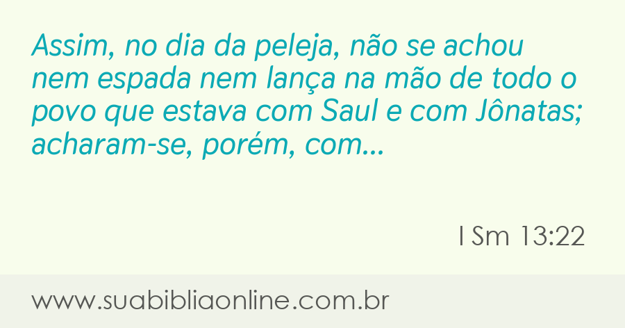 Faça sua busca na Bíblia. Sua Bíblia Online.Versão completa da Bíblia em Português com todos os livros, capítulos e versículos bíblicos.Assim, no dia da peleja, não se achou nem espada nem lança na mão de todo o povo que estava com Saul e com Jônatas; acharam-se, porém, com Saul e com Jônatas seu filho.