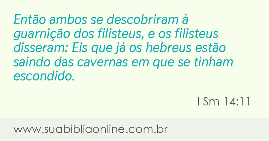 Faça sua busca na Bíblia. Sua Bíblia Online.Versão completa da Bíblia em Português com todos os livros, capítulos e versículos bíblicos.Então ambos se descobriram à guarnição dos filisteus, e os filisteus disseram: Eis que já os hebreus estão saindo das cavernas em que se tinham escondido.