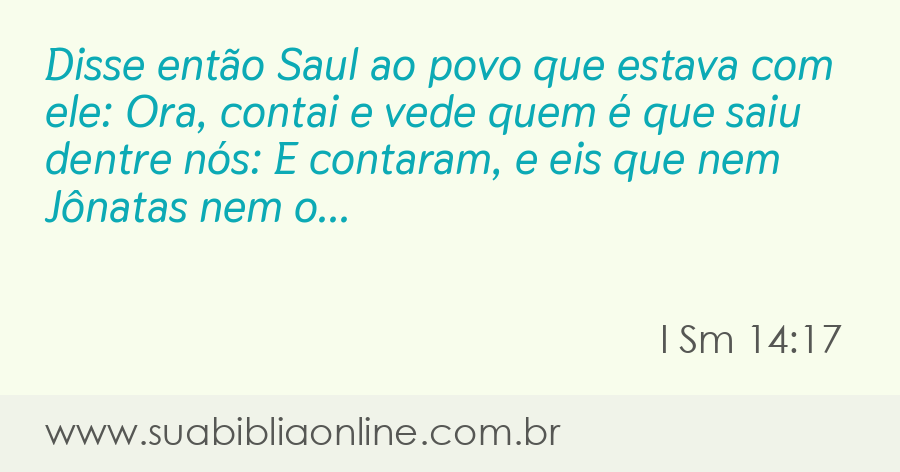 Faça sua busca na Bíblia. Sua Bíblia Online.Versão completa da Bíblia em Português com todos os livros, capítulos e versículos bíblicos.Disse então Saul ao povo que estava com ele: Ora, contai e vede quem é que saiu dentre nós: E contaram, e eis que nem Jônatas nem o seu escudeiro estava ali.