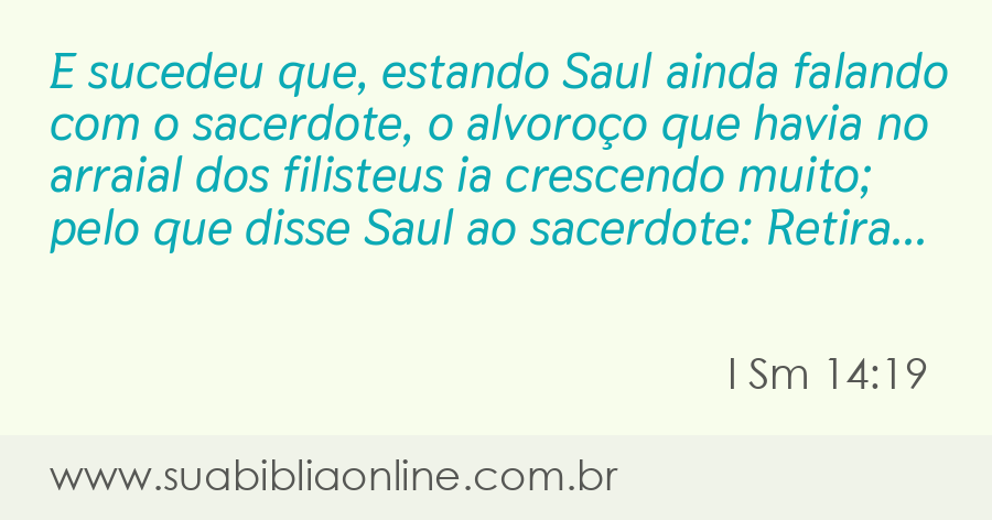 Faça sua busca na Bíblia. Sua Bíblia Online.Versão completa da Bíblia em Português com todos os livros, capítulos e versículos bíblicos.E sucedeu que, estando Saul ainda falando com o sacerdote, o alvoroço que havia no arraial dos filisteus ia crescendo muito; pelo que disse Saul ao sacerdote: Retira a tua mão.