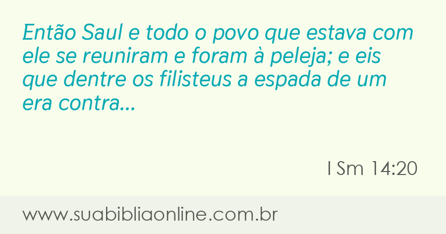 Faça sua busca na Bíblia. Sua Bíblia Online.Versão completa da Bíblia em Português com todos os livros, capítulos e versículos bíblicos.Então Saul e todo o povo que estava com ele se reuniram e foram à peleja; e eis que dentre os filisteus a espada de um era contra o outro, e houve mui grande derrota.