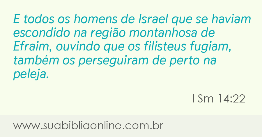 Faça sua busca na Bíblia. Sua Bíblia Online.Versão completa da Bíblia em Português com todos os livros, capítulos e versículos bíblicos.E todos os homens de Israel que se haviam escondido na região montanhosa de Efraim, ouvindo que os filisteus fugiam, também os perseguiram de perto na peleja.