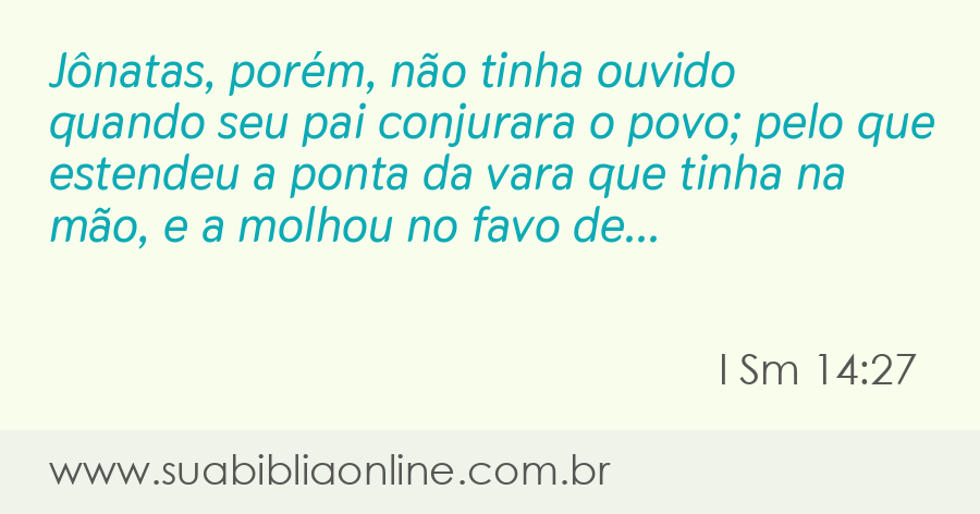Faça sua busca na Bíblia. Sua Bíblia Online.Versão completa da Bíblia em Português com todos os livros, capítulos e versículos bíblicos.Jônatas, porém, não tinha ouvido quando seu pai conjurara o povo; pelo que estendeu a ponta da vara que tinha na mão, e a molhou no favo de mel; e, ao chegar a mão à boca, aclararam-se-lhe os olhos.