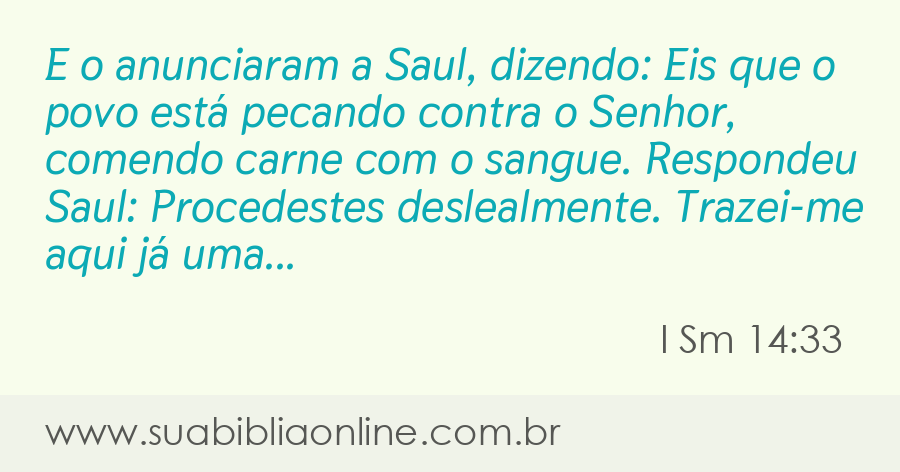 Faça sua busca na Bíblia. Sua Bíblia Online.Versão completa da Bíblia em Português com todos os livros, capítulos e versículos bíblicos.E o anunciaram a Saul, dizendo: Eis que o povo está pecando contra o Senhor, comendo carne com o sangue. Respondeu Saul: Procedestes deslealmente. Trazei-me aqui já uma grande pedra.