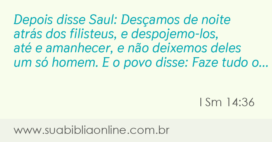 Faça sua busca na Bíblia. Sua Bíblia Online.Versão completa da Bíblia em Português com todos os livros, capítulos e versículos bíblicos.Depois disse Saul: Desçamos de noite atrás dos filisteus, e despojemo-los, até e amanhecer, e não deixemos deles um só homem. E o povo disse: Faze tudo o que parecer bem aos teus olhos. Disse, porém, o sacerdote: Cheguemo-nos aqui a Deus.