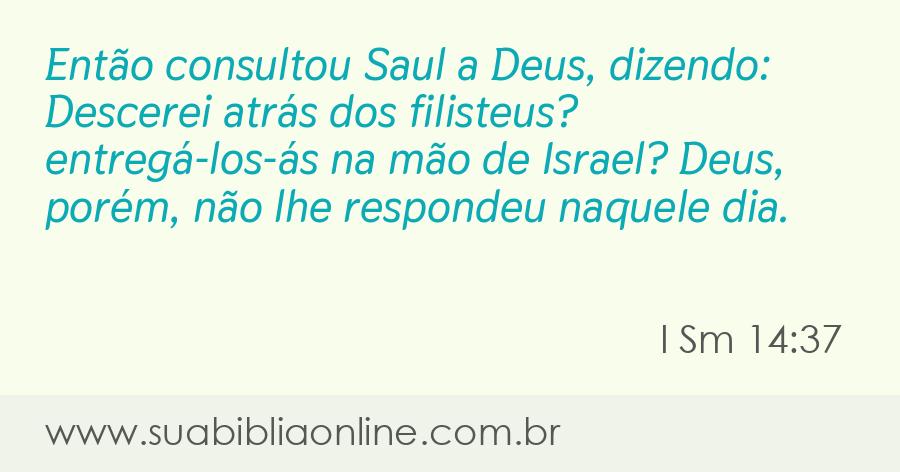Faça sua busca na Bíblia. Sua Bíblia Online.Versão completa da Bíblia em Português com todos os livros, capítulos e versículos bíblicos.Então consultou Saul a Deus, dizendo: Descerei atrás dos filisteus? entregá-los-ás na mão de Israel? Deus, porém, não lhe respondeu naquele dia.