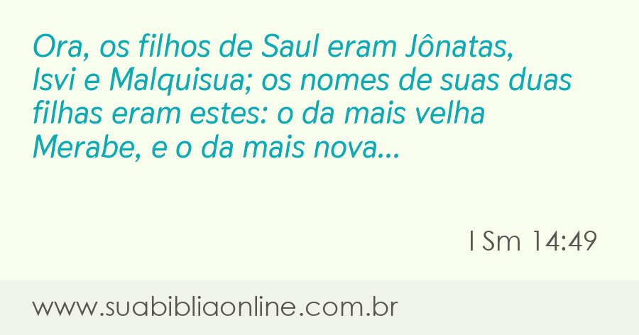 Faça sua busca na Bíblia. Sua Bíblia Online.Versão completa da Bíblia em Português com todos os livros, capítulos e versículos bíblicos.Ora, os filhos de Saul eram Jônatas, Isvi e Malquisua; os nomes de suas duas filhas eram estes: o da mais velha Merabe, e o da mais nova Mical.