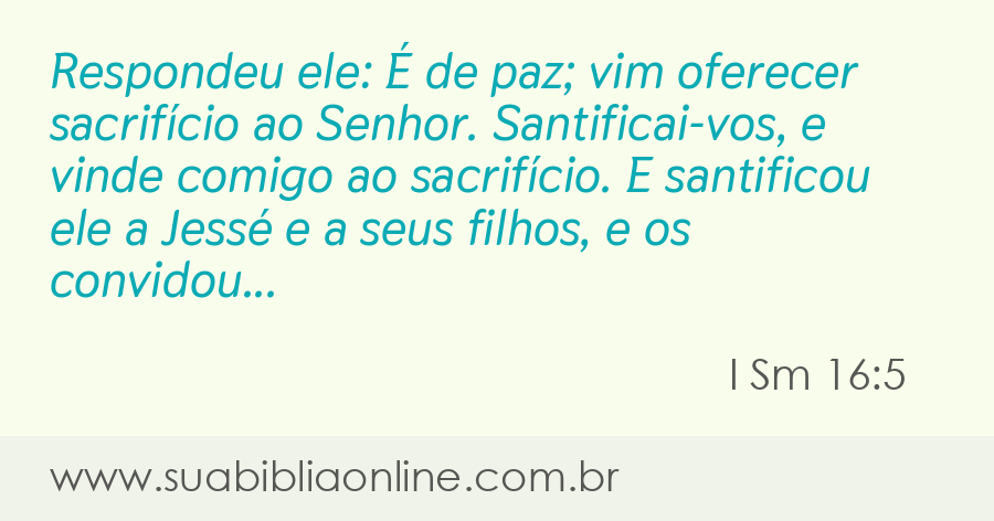 Faça sua busca na Bíblia. Sua Bíblia Online.Versão completa da Bíblia em Português com todos os livros, capítulos e versículos bíblicos.Respondeu ele: É de paz; vim oferecer sacrifício ao Senhor. Santificai-vos, e vinde comigo ao sacrifício. E santificou ele a Jessé e a seus filhos, e os convidou para o sacrifício.