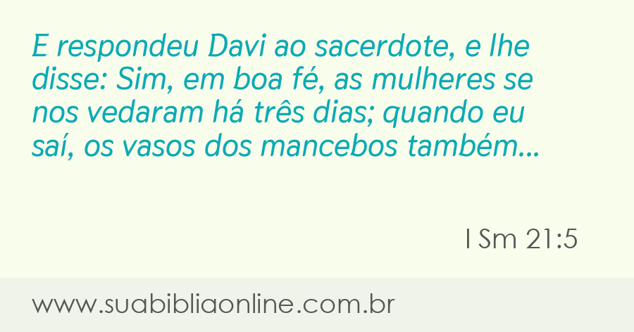 Faça sua busca na Bíblia. Sua Bíblia Online.Versão completa da Bíblia em Português com todos os livros, capítulos e versículos bíblicos.E respondeu Davi ao sacerdote, e lhe disse: Sim, em boa fé, as mulheres se nos vedaram há três dias; quando eu saí, os vasos dos mancebos também eram santos, embora fosse para uma viagem comum; quanto mais ainda hoje não serão santos os seus vasos?