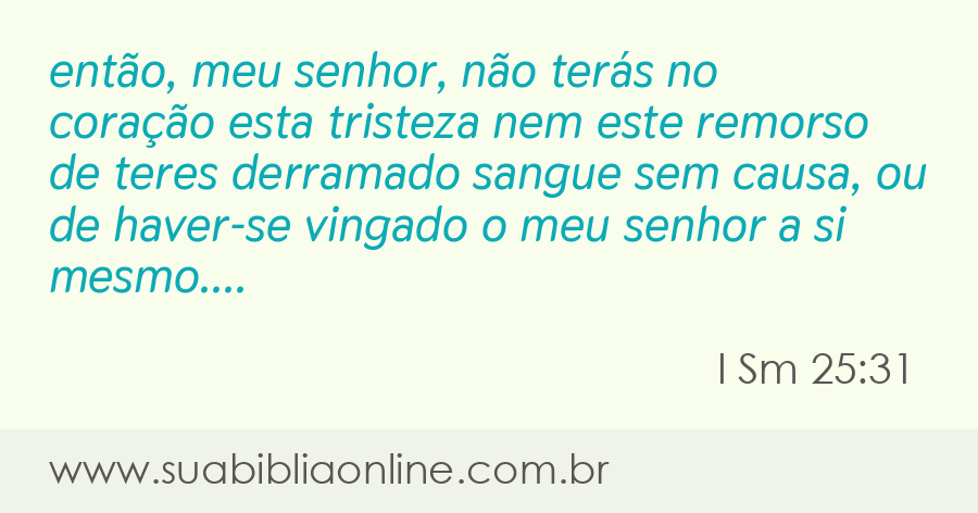 Faça sua busca na Bíblia. Sua Bíblia Online.Versão completa da Bíblia em Português com todos os livros, capítulos e versículos bíblicos.então, meu senhor, não terás no coração esta tristeza nem este remorso de teres derramado sangue sem causa, ou de haver-se vingado o meu senhor a si mesmo. E quando o Senhor fizer bem a meu senhor, lembra-te então da tua serva.
