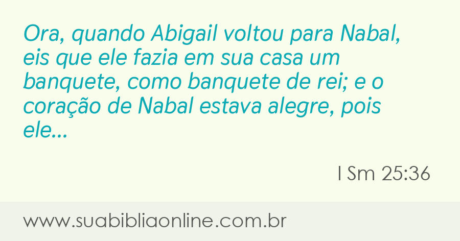 Faça sua busca na Bíblia. Sua Bíblia Online.Versão completa da Bíblia em Português com todos os livros, capítulos e versículos bíblicos.Ora, quando Abigail voltou para Nabal, eis que ele fazia em sua casa um banquete, como banquete de rei; e o coração de Nabal estava alegre, pois ele estava muito embriagado; pelo que ela não lhe deu a entender nada daquilo, nem pouco nem muito, até a luz da manhã.