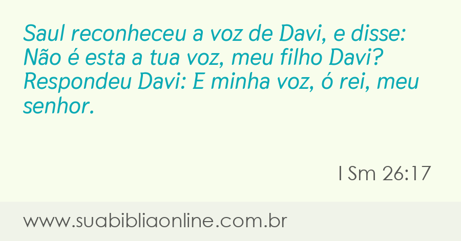 Faça sua busca na Bíblia. Sua Bíblia Online.Versão completa da Bíblia em Português com todos os livros, capítulos e versículos bíblicos.Saul reconheceu a voz de Davi, e disse: Não é esta a tua voz, meu filho Davi? Respondeu Davi: E minha voz, ó rei, meu senhor.