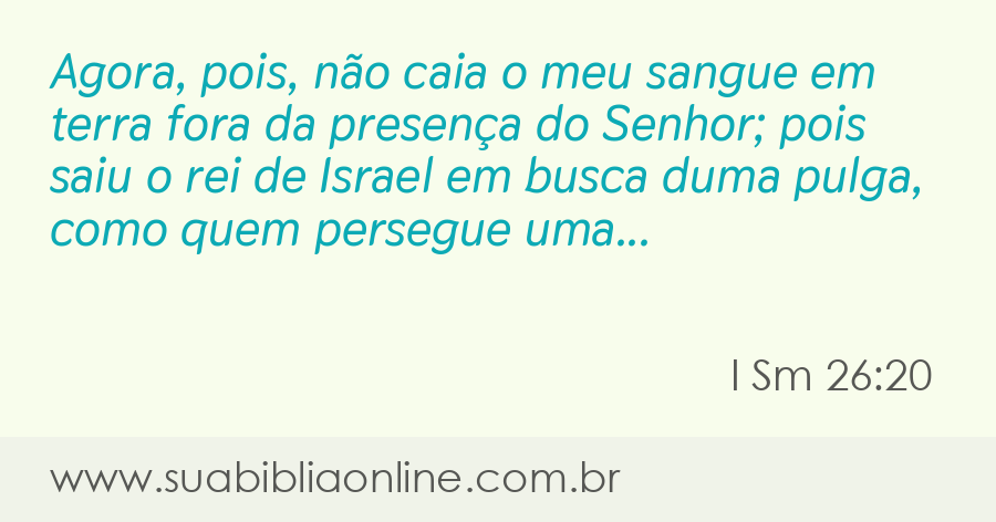Faça sua busca na Bíblia. Sua Bíblia Online.Versão completa da Bíblia em Português com todos os livros, capítulos e versículos bíblicos.Agora, pois, não caia o meu sangue em terra fora da presença do Senhor; pois saiu o rei de Israel em busca duma pulga, como quem persegue uma perdiz nos montes.