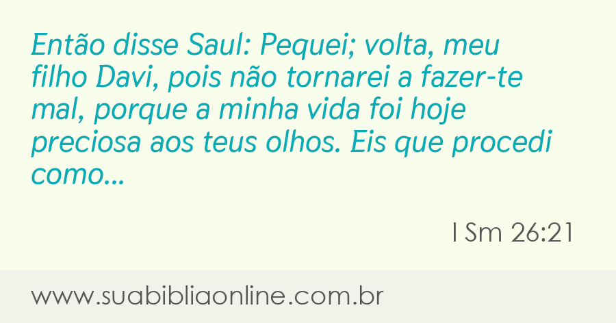Faça sua busca na Bíblia. Sua Bíblia Online.Versão completa da Bíblia em Português com todos os livros, capítulos e versículos bíblicos.Então disse Saul: Pequei; volta, meu filho Davi, pois não tornarei a fazer-te mal, porque a minha vida foi hoje preciosa aos teus olhos. Eis que procedi como um louco, e errei grandissimamente.