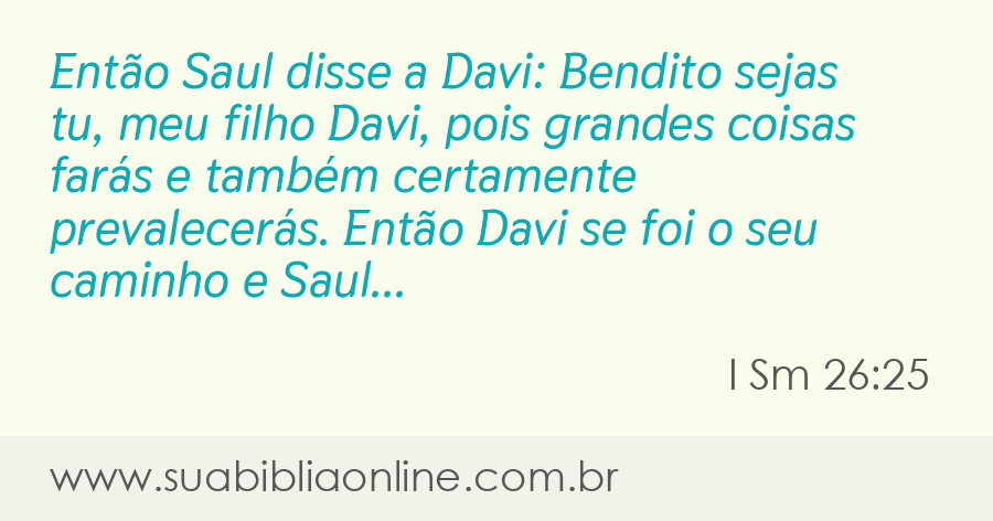 Faça sua busca na Bíblia. Sua Bíblia Online.Versão completa da Bíblia em Português com todos os livros, capítulos e versículos bíblicos.Então Saul disse a Davi: Bendito sejas tu, meu filho Davi, pois grandes coisas farás e também certamente prevalecerás. Então Davi se foi o seu caminho e Saul voltou para o seu lugar.