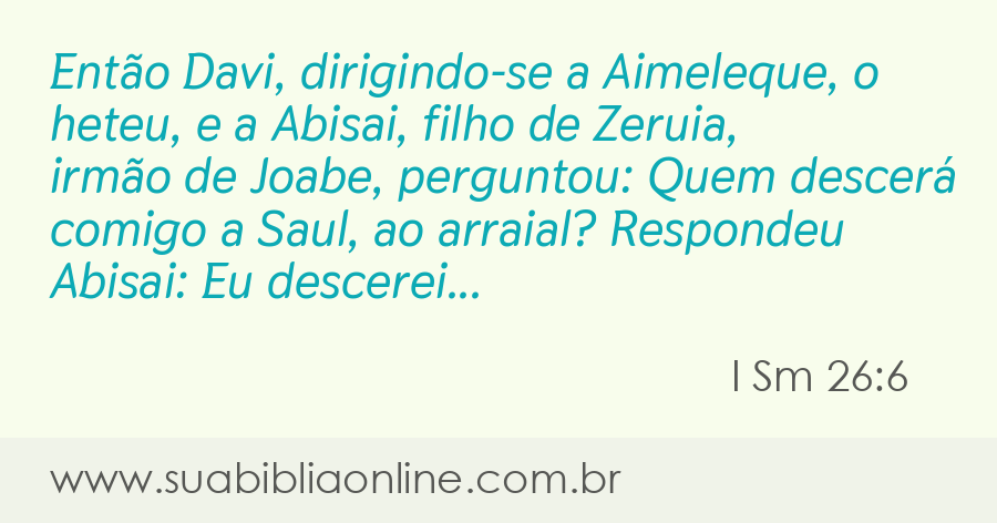 Faça sua busca na Bíblia. Sua Bíblia Online.Versão completa da Bíblia em Português com todos os livros, capítulos e versículos bíblicos.Então Davi, dirigindo-se a Aimeleque, o heteu, e a Abisai, filho de Zeruia, irmão de Joabe, perguntou: Quem descerá comigo a Saul, ao arraial? Respondeu Abisai: Eu descerei contigo.