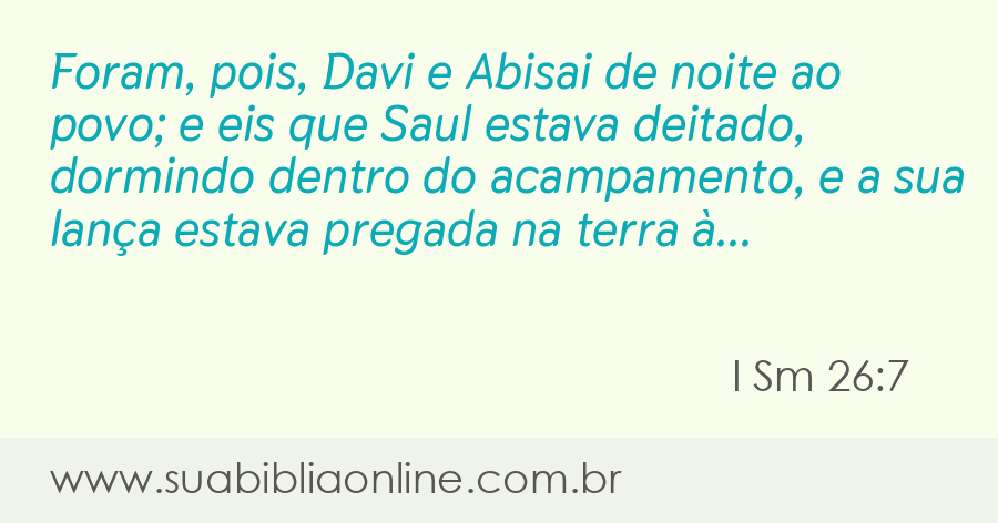 Faça sua busca na Bíblia. Sua Bíblia Online.Versão completa da Bíblia em Português com todos os livros, capítulos e versículos bíblicos.Foram, pois, Davi e Abisai de noite ao povo; e eis que Saul estava deitado, dormindo dentro do acampamento, e a sua lança estava pregada na terra à sua cabeceira; e Abner e o povo estavam deitados ao redor dele.
