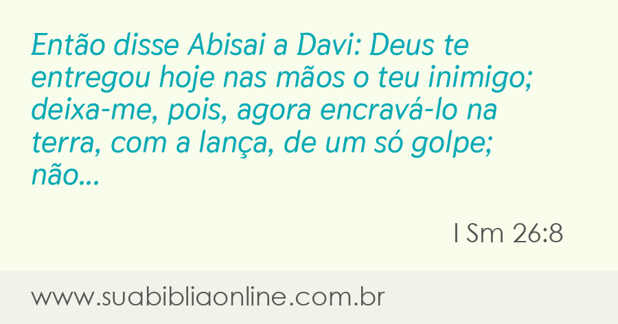 Faça sua busca na Bíblia. Sua Bíblia Online.Versão completa da Bíblia em Português com todos os livros, capítulos e versículos bíblicos.Então disse Abisai a Davi: Deus te entregou hoje nas mãos o teu inimigo; deixa-me, pois, agora encravá-lo na terra, com a lança, de um só golpe; não o ferirei segunda vez.