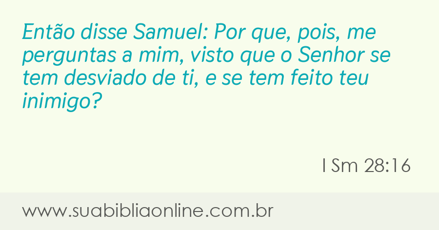 Faça sua busca na Bíblia. Sua Bíblia Online.Versão completa da Bíblia em Português com todos os livros, capítulos e versículos bíblicos.Então disse Samuel: Por que, pois, me perguntas a mim, visto que o Senhor se tem desviado de ti, e se tem feito teu inimigo?