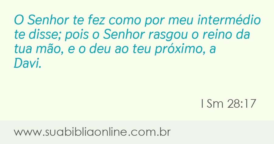 Faça sua busca na Bíblia. Sua Bíblia Online.Versão completa da Bíblia em Português com todos os livros, capítulos e versículos bíblicos.O Senhor te fez como por meu intermédio te disse; pois o Senhor rasgou o reino da tua mão, e o deu ao teu próximo, a Davi.