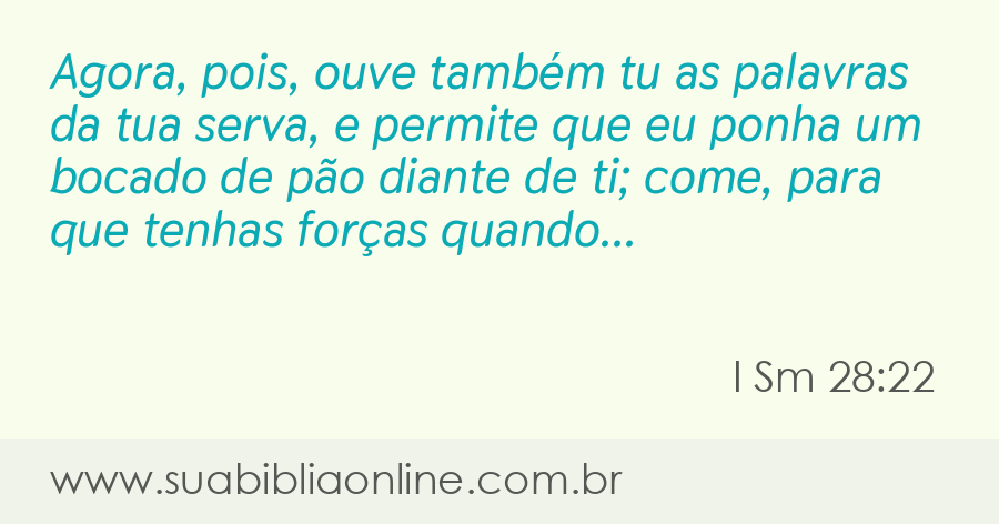 Faça sua busca na Bíblia. Sua Bíblia Online.Versão completa da Bíblia em Português com todos os livros, capítulos e versículos bíblicos.Agora, pois, ouve também tu as palavras da tua serva, e permite que eu ponha um bocado de pão diante de ti; come, para que tenhas forças quando te puseres a caminho.