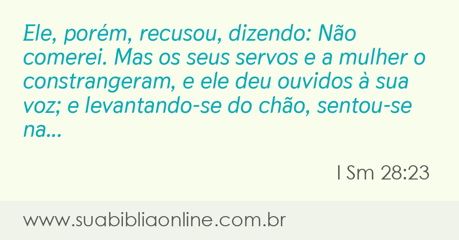 Faça sua busca na Bíblia. Sua Bíblia Online.Versão completa da Bíblia em Português com todos os livros, capítulos e versículos bíblicos.Ele, porém, recusou, dizendo: Não comerei. Mas os seus servos e a mulher o constrangeram, e ele deu ouvidos à sua voz; e levantando-se do chão, sentou-se na cama.