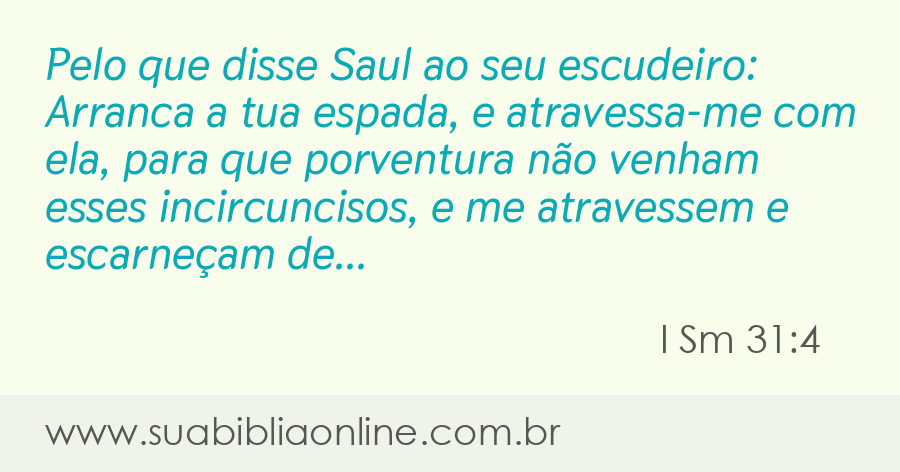 Faça sua busca na Bíblia. Sua Bíblia Online.Versão completa da Bíblia em Português com todos os livros, capítulos e versículos bíblicos.Pelo que disse Saul ao seu escudeiro: Arranca a tua espada, e atravessa-me com ela, para que porventura não venham esses incircuncisos, e me atravessem e escarneçam de mim. Mas o seu escudeiro não quis, porque temia muito. Então Saul tomou a espada, e se lançou sobre ela.