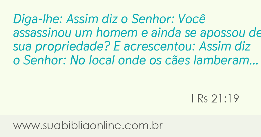 E falar-lhe-ás, dizendo: Assim diz o Senhor: Porventura não mataste e tomaste a herança? Falar-lhe-ás mais, dizendo: Assim diz o Senhor: No lugar em que os cães lamberam o sangue de Nabote, lamberão também o teu próprio sangue.