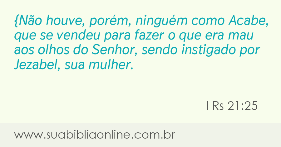 (Não houve, porém, ninguém como Acabe, que se vendeu para fazer o que era mau aos olhos do Senhor, sendo instigado por Jezabel, sua mulher.