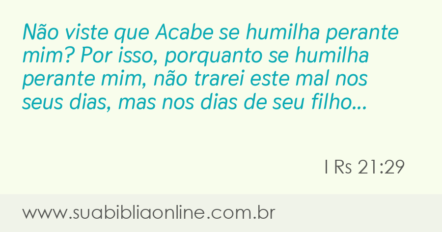 Não viste que Acabe se humilha perante mim? Por isso, porquanto se humilha perante mim, não trarei o mal enquanto ele viver, mas nos dias de seu filho trarei o mal sobre a sua casa.