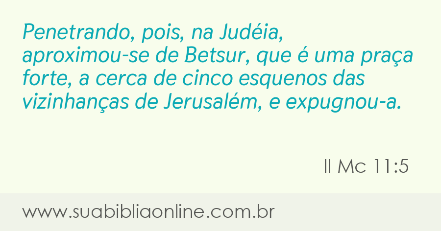 Penetrando, pois, na Judéia, aproximou-se de Betsur, que é uma praça forte, a cerca de cinco esquenos das vizinhanças de Jerusalém, e expugnou-a.