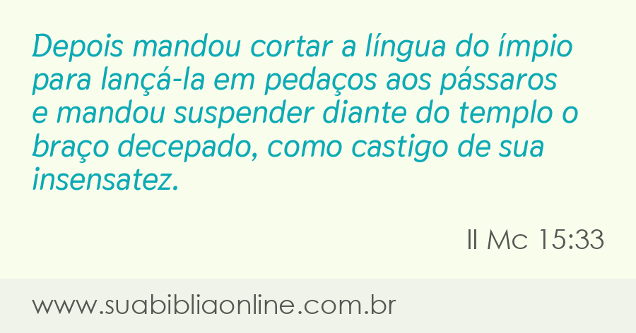 Depois mandou cortar a língua do ímpio para lançá-la em pedaços aos pássaros e mandou suspender diante do templo o braço decepado, como castigo de sua insensatez.