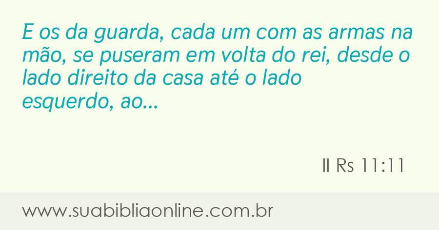 Faça sua busca na Bíblia. Sua Bíblia Online.Versão completa da Bíblia em Português com todos os livros, capítulos e versículos bíblicos.E os da guarda, cada um com as armas na mão, se puseram em volta do rei, desde o lado direito da casa até o lado esquerdo, ao longo do altar e da casa.