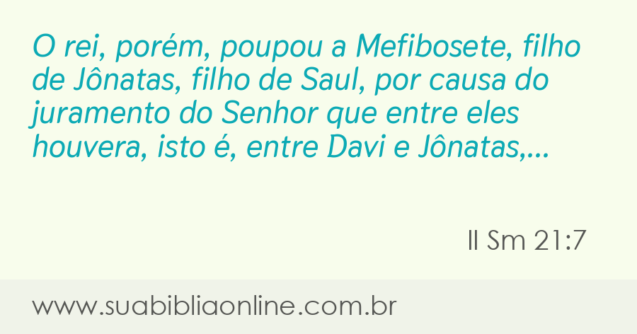 O rei, porém, poupou a Mefibosete, filho de Jônatas, filho de Saul, por causa do juramento do Senhor que entre eles houvera, isto é, entre Davi e Jônatas, filho de Saul.