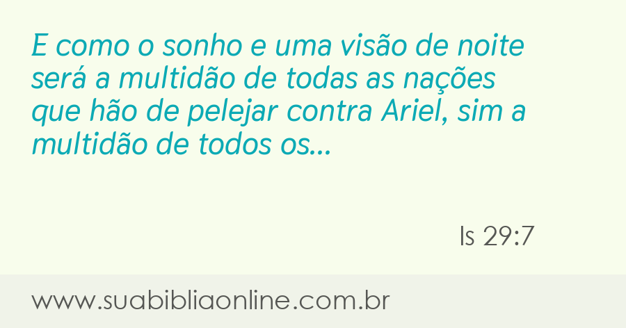 Faça sua busca na Bíblia. Sua Bíblia Online.Versão completa da Bíblia em Português com todos os livros, capítulos e versículos bíblicos.E como o sonho e uma visão de noite será a multidão de todas as nações que hão de pelejar contra Ariel, sim a multidão de todos os que pelejarem contra ela e contra a sua fortaleza e a puserem em aperto.