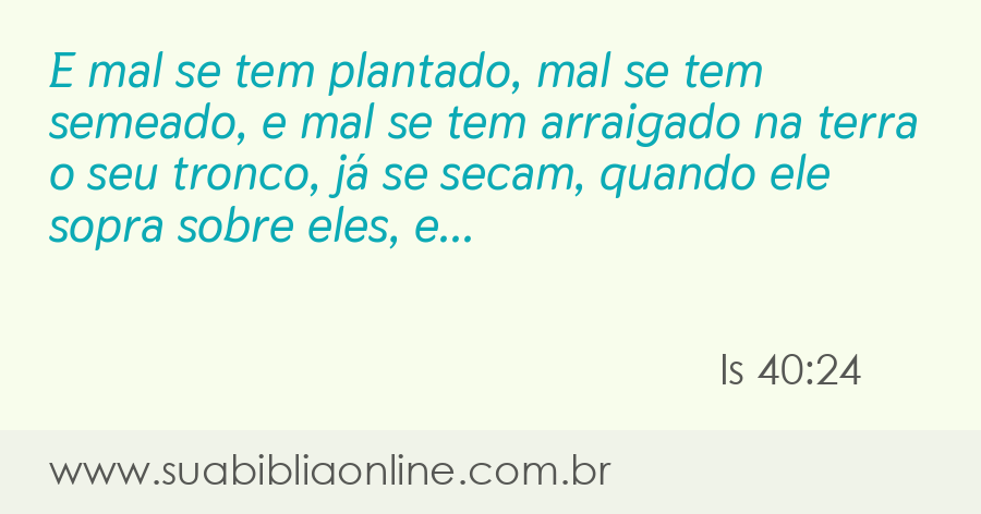 Faça sua busca na Bíblia. Sua Bíblia Online.Versão completa da Bíblia em Português com todos os livros, capítulos e versículos bíblicos.Na verdade, mal se tem plantado, mal se tem semeado e mal se tem arraigado na terra o seu tronco, quando ele sopra sobre eles, e secam-se, e a tempestade os leva como à pragana.