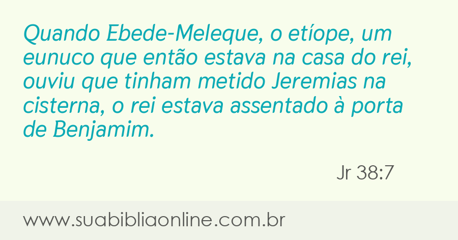 Quando Ebede-Meleque, o etíope, um eunuco que então estava na casa do rei, ouviu que tinham metido Jeremias na cisterna, o rei estava assentado à porta de Benjamim.
