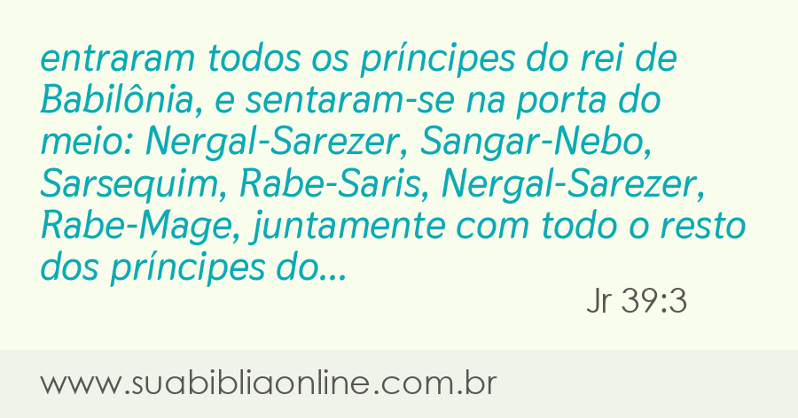 E entraram todos os príncipes do rei de Babilônia, e sentaram-se na porta do meio, os quais eram Nergal-Sarezer, SangarNebo, Sarsequim, Rabe-Sáris Nergal Sarezer, Rabe-Maque, juntamente, com todo o resto dos príncipes do rei de Babilônia