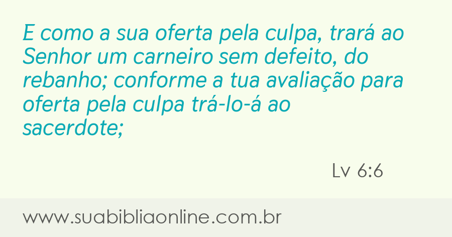 Faça sua busca na Bíblia. Sua Bíblia Online.Versão completa da Bíblia em Português com todos os livros, capítulos e versículos bíblicos.E como a sua oferta pela culpa, trará ao Senhor um carneiro sem defeito, do rebanho; conforme a tua avaliação para oferta pela culpa trá-lo-á ao sacerdote;