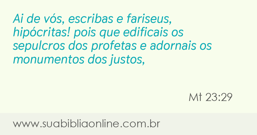 Faça sua busca na Bíblia. Sua Bíblia Online.Versão completa da Bíblia em Português com todos os livros, capítulos e versículos bíblicos.Ai de vós, escribas e fariseus, hipócritas! porque edificais os sepulcros dos profetas e adornais os monumentos dos justos,