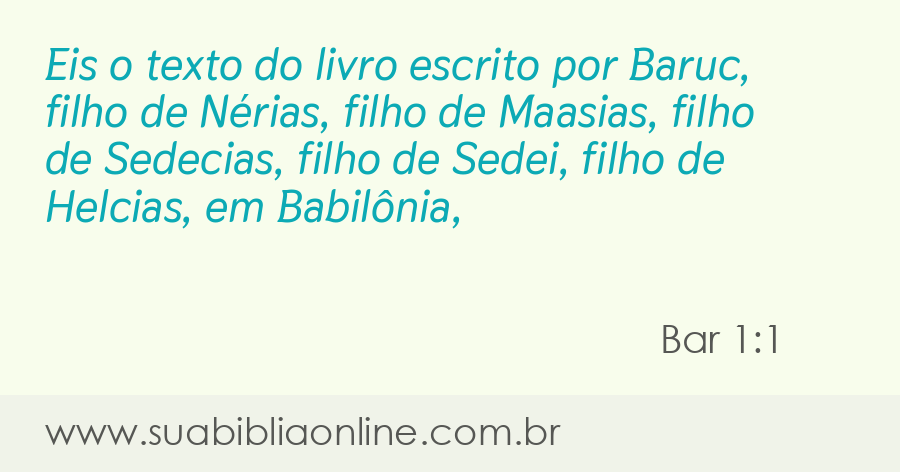 Faça sua busca na Bíblia. Sua Bíblia Online.Versão completa da Bíblia em Português com todos os livros, capítulos e versículos bíblicos.Eis o texto do livro escrito por Baruc, filho de Nérias, filho de Maasias, filho de Sedecias, filho de Sedei, filho de Helcias, em Babilônia,