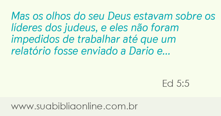 Faça sua busca na Bíblia. Sua Bíblia Online.Versão completa da Bíblia em Português com todos os livros, capítulos e versículos bíblicos.Mas os olhos do seu Deus estavam sobre os líderes dos judeus, e eles não foram impedidos de trabalhar até que um relatório fosse enviado a Dario e dele se recebesse uma ordem oficial a respeito do assunto.