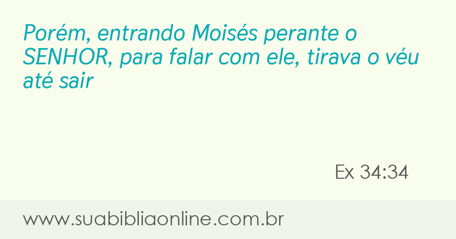 Faça sua busca na Bíblia. Sua Bíblia Online.Versão completa da Bíblia em Português com todos os livros, capítulos e versículos bíblicos.Mas toda vez que entrava para estar na presença do Senhor e falar com ele, tirava o véu até sair. Sempre que saía e contava aos israelitas tudo o que lhe havia sido ordenado,